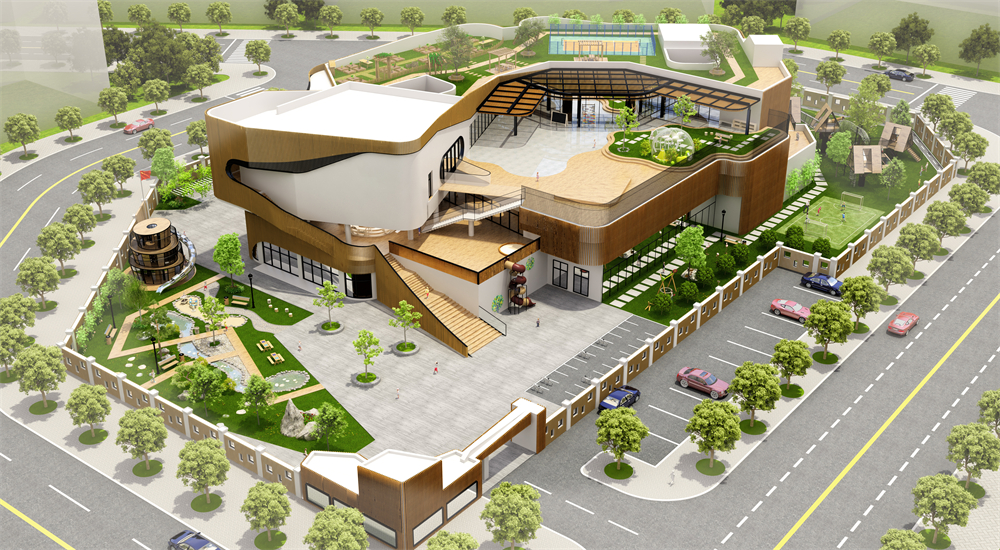 設(shè)計(jì)理念:冰川幼兒園以幾何元素為主題,結(jié)合建筑造型,對(duì)建筑元素進(jìn)行延伸運(yùn)用。以幾何做造型,以地形為互動(dòng)元素,勾勒出特色的主題園。小樹與大樹為構(gòu)圖元素,利用林間穿梭的水池,灌木等元素做承托,整個(gè)幼兒園呈現(xiàn)一幅生生不息的自然畫卷。 -